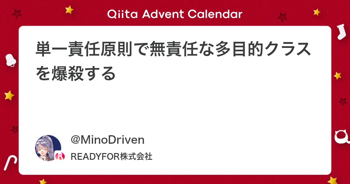 そして単一責任の原則とは「クラスが担う責任を、たった1つに限定しようぜ!」という原則です。